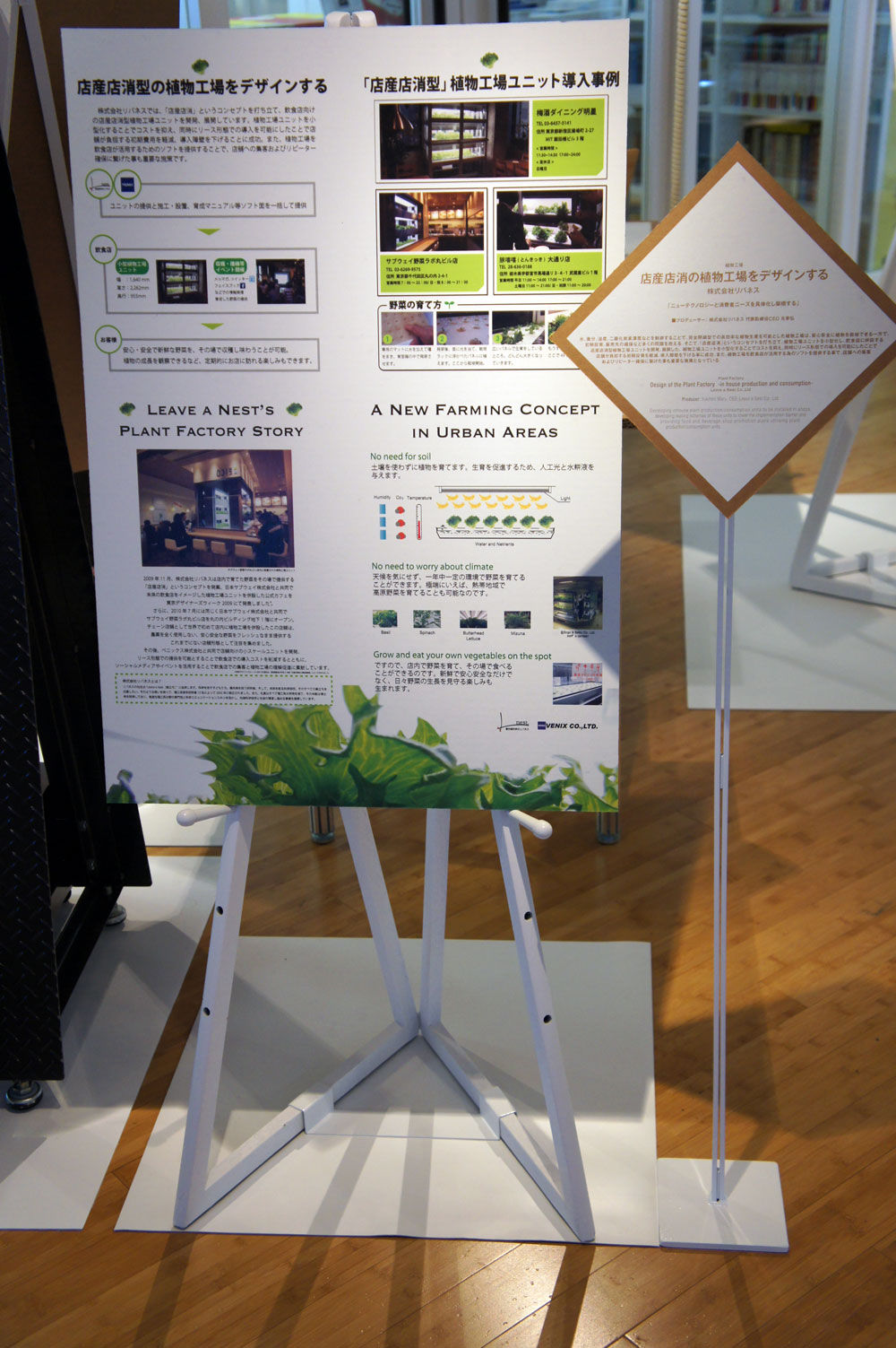 リバネスの植物工場は、サイズの問題から実機を展示することが出来ませんでしたが、店産店消型植物工場ユニットの紹介パネルを展示しています。実物をご覧になりたい方は、梅酒ダイニング明星(東京都 飯田橋)に是非お越しください。実際に植物を栽培している姿をご覧いただけます。