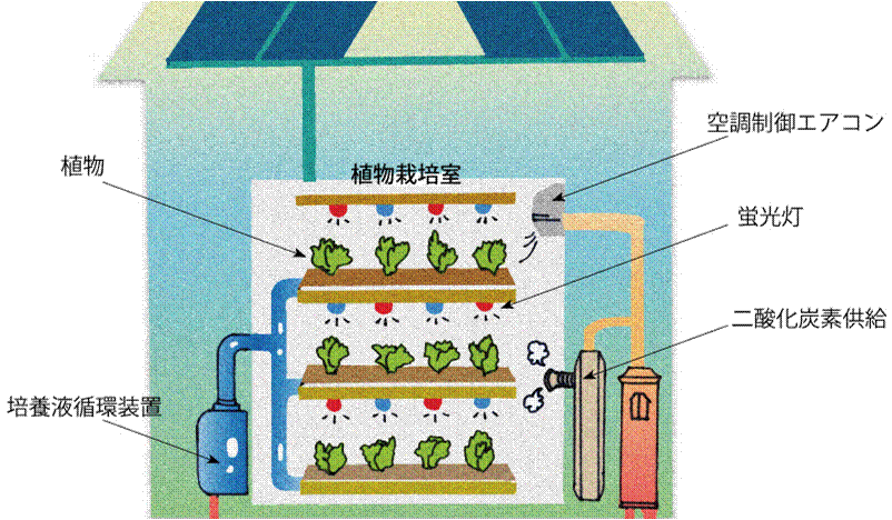 植物が育つには,二酸化炭素,酸素,リン酸や窒素,カリウムなどの必須元素,鉄やマグネシウムなどの微量元素,光,水分,そして適切な温度が必要です。これまでの農業は,自然の中で作物を育てるために,天候の影響を大きく受けていました。また,台風の直撃や病気,害虫の被害も避けられません。