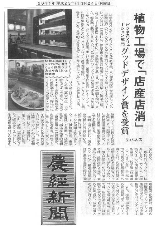 ホーム ニュース 【新聞掲載】グッドデザイン... ニュース 【新聞掲載】グッドデザイン賞受賞、農経新聞に掲載 から 塚田周平 - 2011年10月24日 2119 0 Facebook Twitter Google+ Pinterest WhatsApp 「店産店消」の植物工場モデルについて、2011年10月24日付の農経新聞に掲載されました。 これまでのリバネスでの植物工場事業においての取り組みや、店産店消型モデルの紹介、サービスについて記載頂いております。 是非ご覧ください。